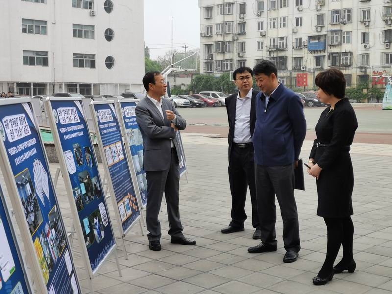 刘国雄校长,宋妍妍副校长陪同教委孙迅副主任,信息中心于瑞利副主任参观展板