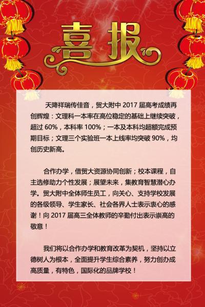 天降祥瑞传佳音,贸大附中2017届高考成绩再创辉煌:文理科一本率在高位稳定的基础上继续突破,超过60%,本科率100%;一本及本科均超额完成预期目标;文理三个实验班一本上线率均突破90%,均创历史新高。