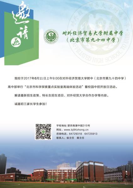 我校于2017年6月11日上午9:00在对外经济贸易大学附属中学(北京市第九十四中学)高中部举行“北京市科学探索重点实验室体验活动”暨校园中招开放日活动。解读最新招生政策、特长生招生项目、对外经贸大学合作办学等内容。诚邀初三家长学生参加!