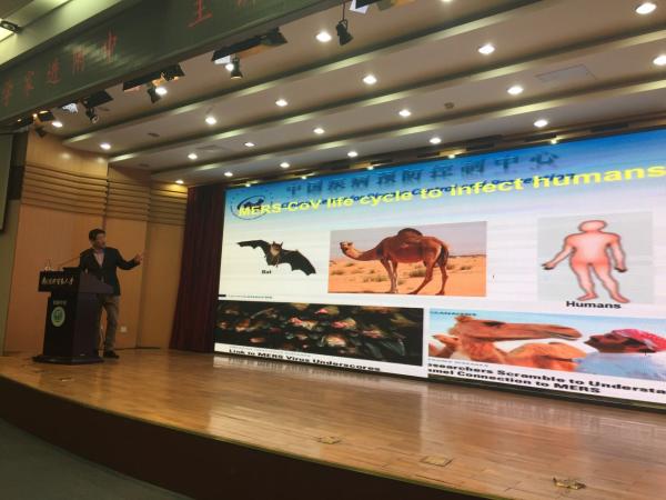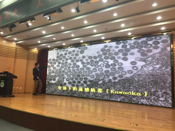 讲座开始,高福院士首先向大家介绍了传染病形势:病原跨物种传播。高院士向我们展示了许多让人们闻风颤栗的传染病,包括MARS、AIDS、埃博拉、禽流感……电子显微镜照片和制作精美的模拟动画将种种病原体的真容呈现在师生面前。