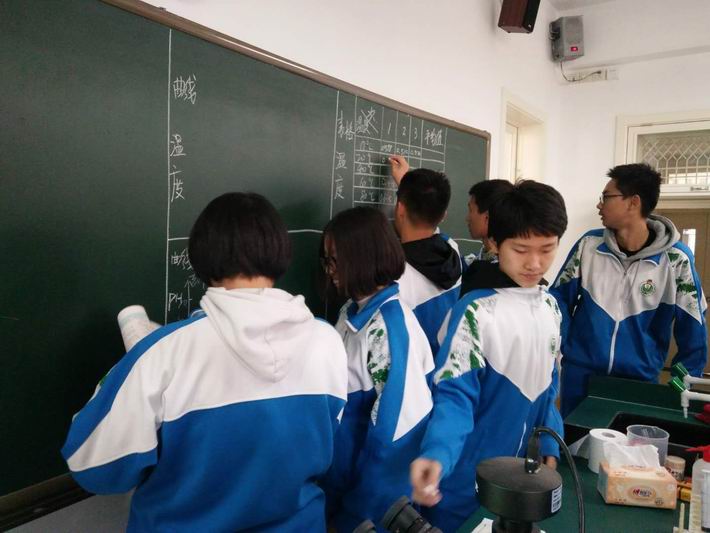 刘国雄校长、石化功、汤守平等各位领导、生物组全体教师及其他学科青年教师参加了本次活动。杨老师的课首先由酶的概念引入,学生在回忆过氧化氢分解实验的基础上,很容易就能说出酶的第一个特性—高效性,既复习了上节课的内容又为本节课做铺垫。在本节课中,杨老师通过问题的创设,不断引领学生思考并运用相关知识,自主设计实验,探究酶的特性,学生通过小组合作的方式完成了温度和pH对酶活性影响的实验,提高了逻辑思维及动手能力,锻炼了学生的理性思维和科学探究的能力。最后学生根据获得的真实数据生成曲线,锻炼学生图表转换的能力,学生根据实验现象分析相关曲线,提高了分析问题解决问题的能力。最值得一提的是此次课上,杨老师发挥专业特长,将分光光度计引入课堂,同时设计巧妙的装置收集氧气,使整个科学探究实验由定性到定量,学生也从中体会到科学研究的严谨和细致。