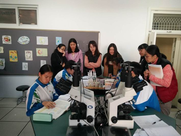 2017年12月6日对外经济贸易大学附属中学高中部,生物组青年教师杨彩云老师在生物实验室S209进行了活力课堂研讨课,带领学生探究酶的特性。