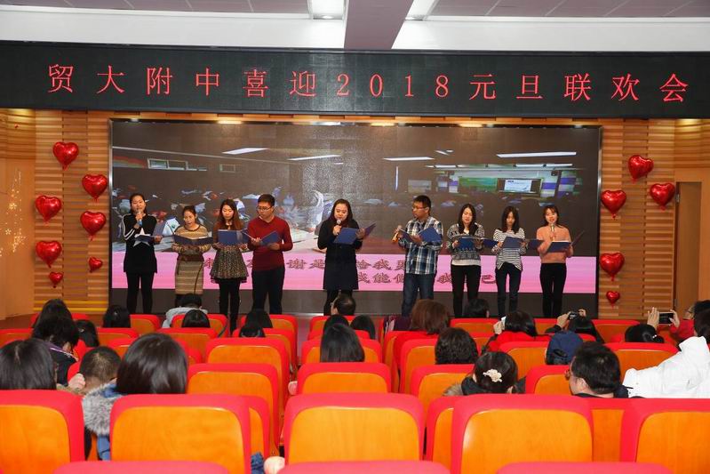 2017年12月29日,贸大附中全体教职工欢聚一堂,共迎2018年新春的到来。在新课改浪潮下大胆创新的学科组代表,以展演的形式与师生分享学科组文化,凸显学科组特色;初高中学生为感谢师恩献上民乐演奏及古典舞,高雅的艺术品位反映学校一年来素质教育的成果。刘国雄校长致新春贺词,向为学校发展贡献力量的全体教职工致谢。