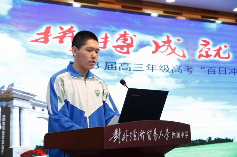 “冲刺百日 决胜高考”的坚定誓言响彻贸大附中的校园,高三各班两班一组以饱满、高亢的声音喊出各自班级誓师口号,随后进行了集体宣誓,由此吹响了决战2018年高考的号角。