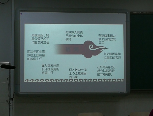 宋妍妍书记的党课首先从总结本学期大事和本学期工作亮点开篇,对全体初中支部党员提出落实党章强化党员教育管理要求,同时要求全体初中支部党员在新形势下:提升自身格局 ,勇于应对挑战, 积极丰富精神境界。