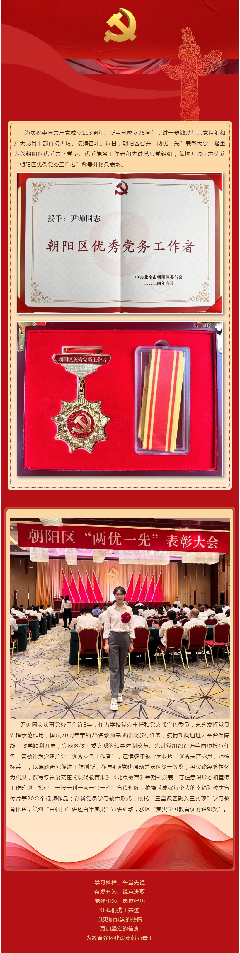 喜报丨朝阳区“两优一先”表彰!贸大附中尹帅同志被授予“优秀党务工作者”称号
